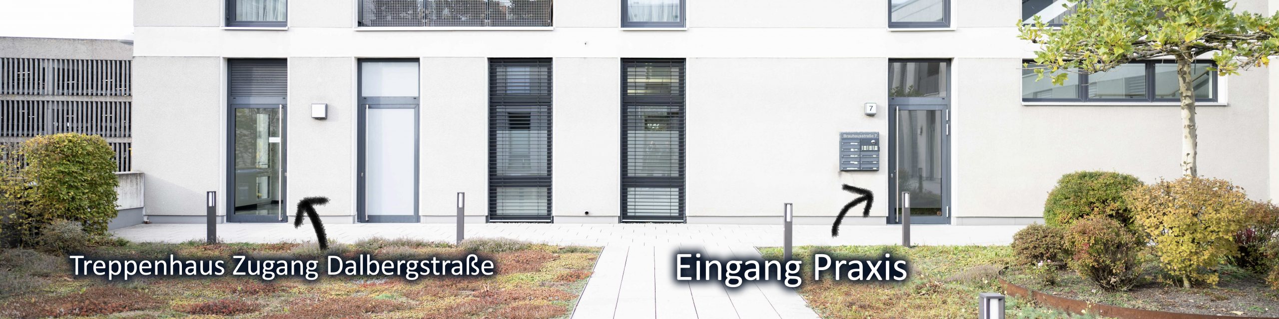 Im Innenhof finden Sie rechts den direkten Eingang zur Praxis (Haus Nr. 7). Links daneben befindet sich das Treppenhaus mit Zugang über die Dalbergstraße